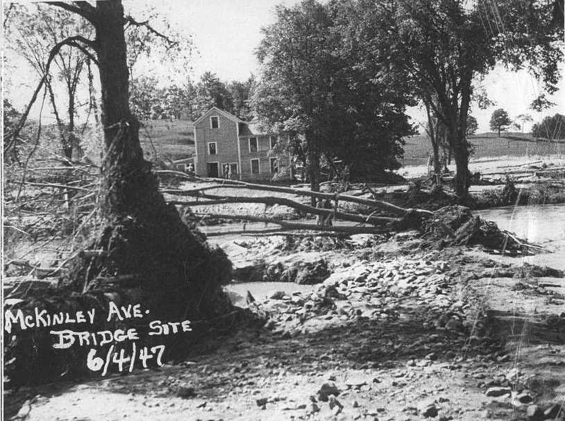 Mill Village Bridge over East Creek in Rutland, Rutland County, VT during the flood. Lost in the June 1947 flood. Rutland Historical Society Collection Mill Village Bridge, VT, site after the June 1947 flood caused by failure of the East Pittsford Dam. Rutland Historical Society Collection